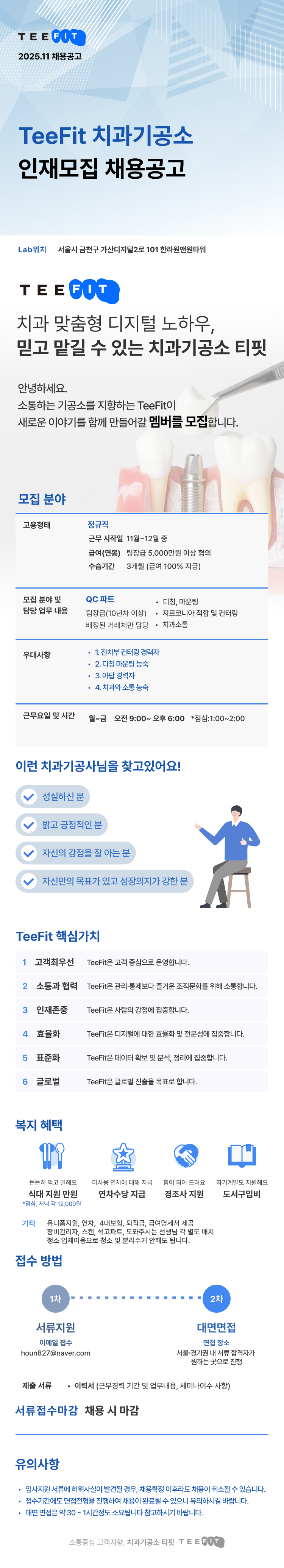 끊임없이 발전이 있는 기공소에 실력있고 열정있는 선생님들의 많은 지원 기다리겠습니다